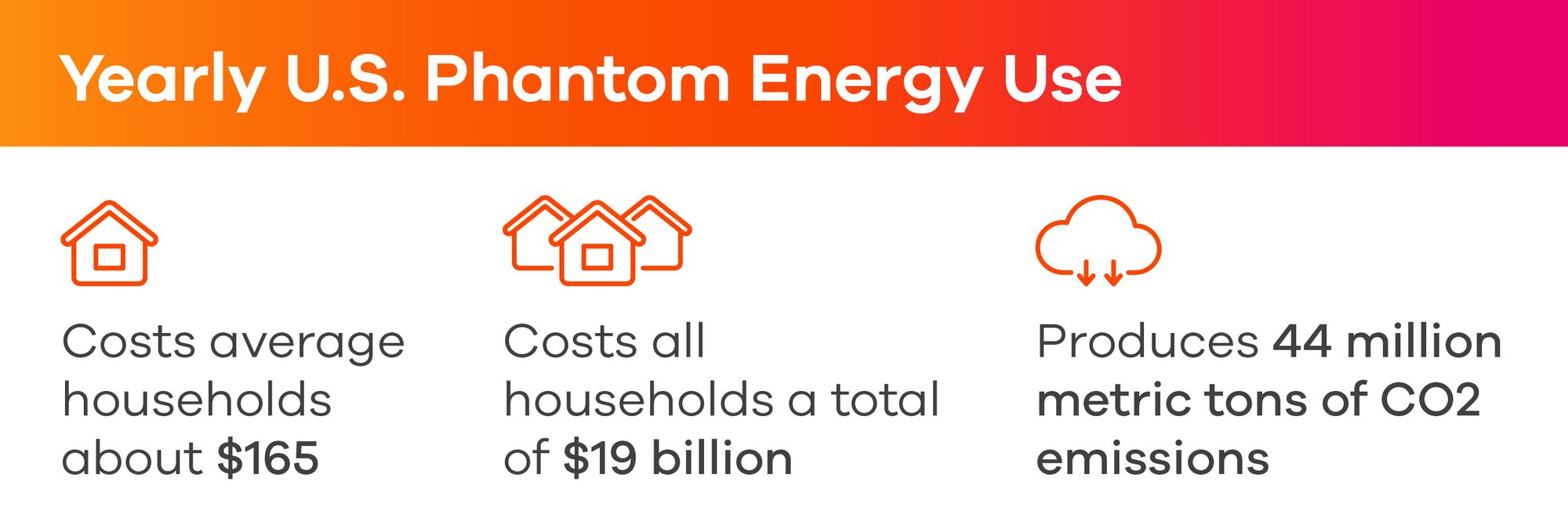 In U.S. households, phantom energy can sometimes account for up to 23% of a household’s electricity use, according to the National Resource Defense Council. And on average, according to the U.S. Department of Energy, phantom energy collectively costs U.S. households about $19 billion a year. This wasted energy also impacts our environment, as it accounts for about 44 million metric tons of CO2 dispersed into the atmosphere annually.